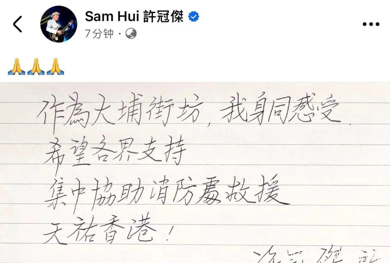 77岁的许冠杰写了手写信:“作为大埔街坊,我感同身受,希望各界支持,集中协助消防处救援,天佑香港!”看得人泪目。