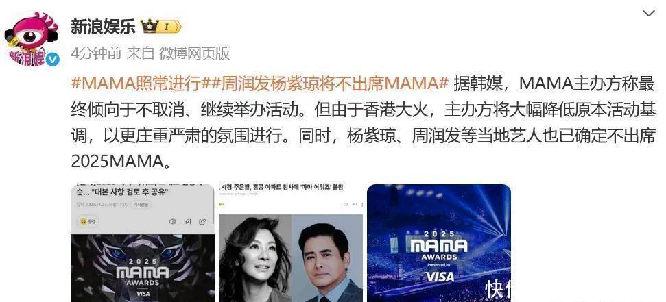 而11月28日至29日在香港启德体育园举办的大型音乐活动“2025 MAMA盛典”,在召开紧急会议后决定如期举行,但弱化了娱乐性,增加默哀环节。
