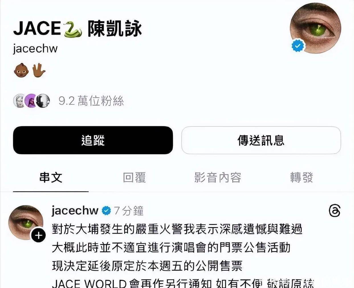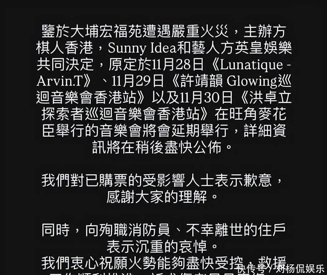 同时英皇公司宣布旗下艺人近期在香港的演唱会活动全部延期,并感谢大家的理解,希望救援工作顺利推进,伤者早日康复。
