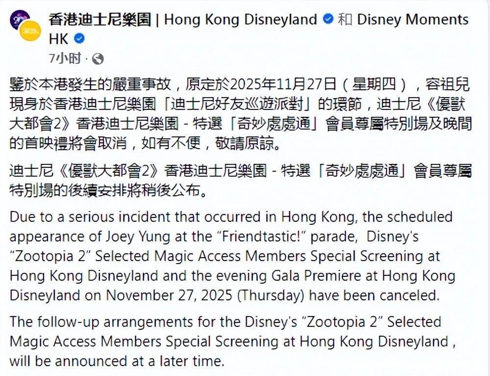 香港迪士尼也取消了《疯狂动物城2》的香港首映礼,原本有容祖儿等艺人现身港迪与大家互动。