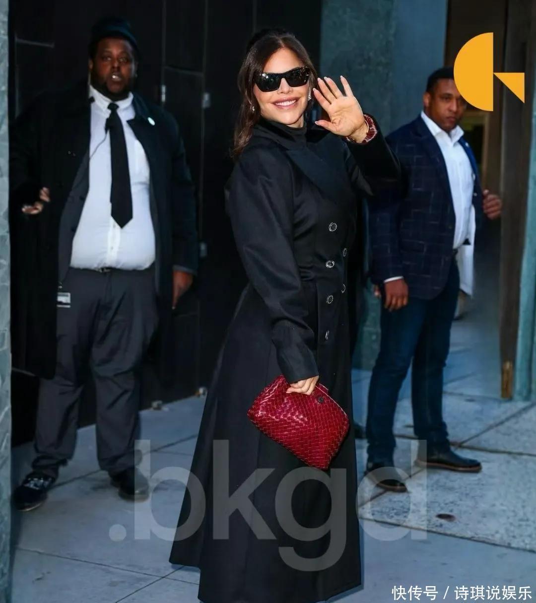 当天她罕见地包裹严实,可以说全身密不透风,外套是双排口深色长款风衣,脚蹬长筒高跟皮靴,里面是高领套头衫和A字格尼裙子。