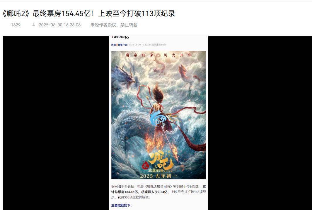 2025年春节档上映后,影片一路高歌猛进,四次延期放映,最终以154.45亿元国内票房收官。