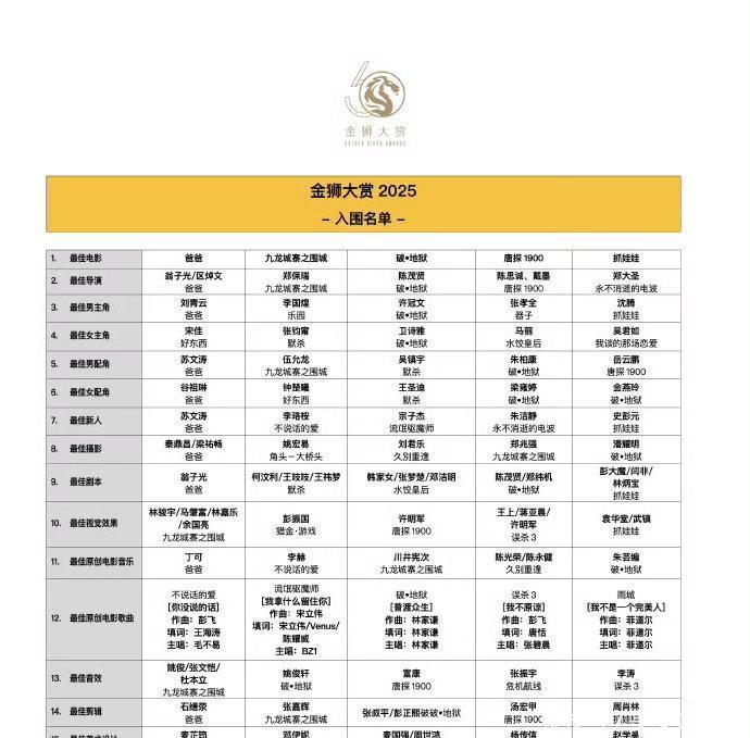 行业这边,筹委会主席许振荣表示“入围作品能看出华语电影的多元发展”,影评人李星文也说:“跨地域覆盖加上包容不同类型,金狮大赏刚好填补了金马奖、金像奖、金鸡奖的空白”。不过争议也存在,有些网友觉得“首届赛事才50多部影片报名,含金量还得再看看”,还有人提醒“这个金狮大赏是新加坡新设的,和威尼斯国际电影节的金狮奖不是一回事”——要知道威尼斯金狮奖历史上只有7部华语片拿过最佳影片,比如侯孝贤的《悲情城市》、李安的《色·戒》,而辛芷蕾是2025年的威尼斯影后。