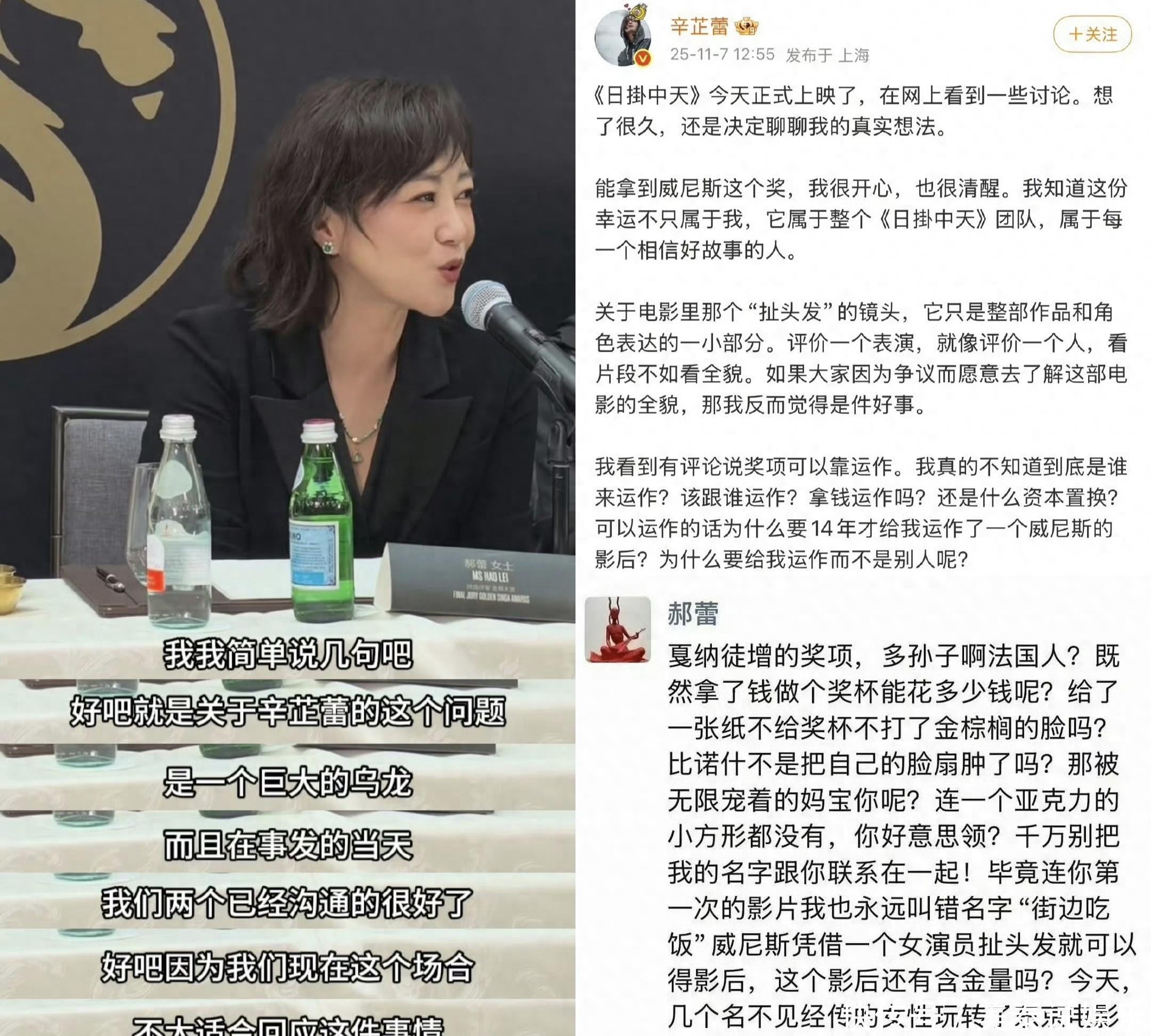 要说当天最受关注的,还是评委郝蕾的现场回应。媒体见面会现场星光熠熠,24K镀金奖座静静摆在舞台中央,新加坡国花卓锦万代兰的浮雕在灯光下闪着光。身着黑色丝绒长裙的郝蕾刚坐下,就被围上来的记者追问之前朋友圈的争议,她抬手让大家稍安勿躁,语气坚定地说:“这就是个天大的乌龙,我说的压根不是辛芷蕾”。她还透露,11月7日事发当天就已经和辛芷蕾私下沟通过,双方早就和解了,同时也提到“评奖有很多观众看不到的复杂流程,评委全靠专业度和艺术良心”,坦言自己更偏爱真诚的表演,不是单纯的技术流,“这没有绝对的对错,获奖有时候也需要点运气”。