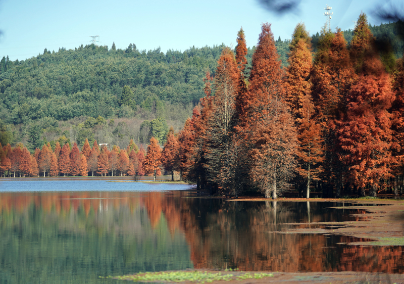 11月28日在云南省昆明市西山区三家村水库拍摄的水杉。初冬时节,部分树木色彩依旧斑斓,美景如画。新华社发(梁志强摄)