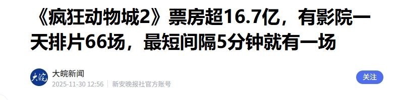 大皖新闻2025-11-30《疯狂动物城2》票房超16.7亿,有影院一天排片66场,最短间隔5分钟就有一场