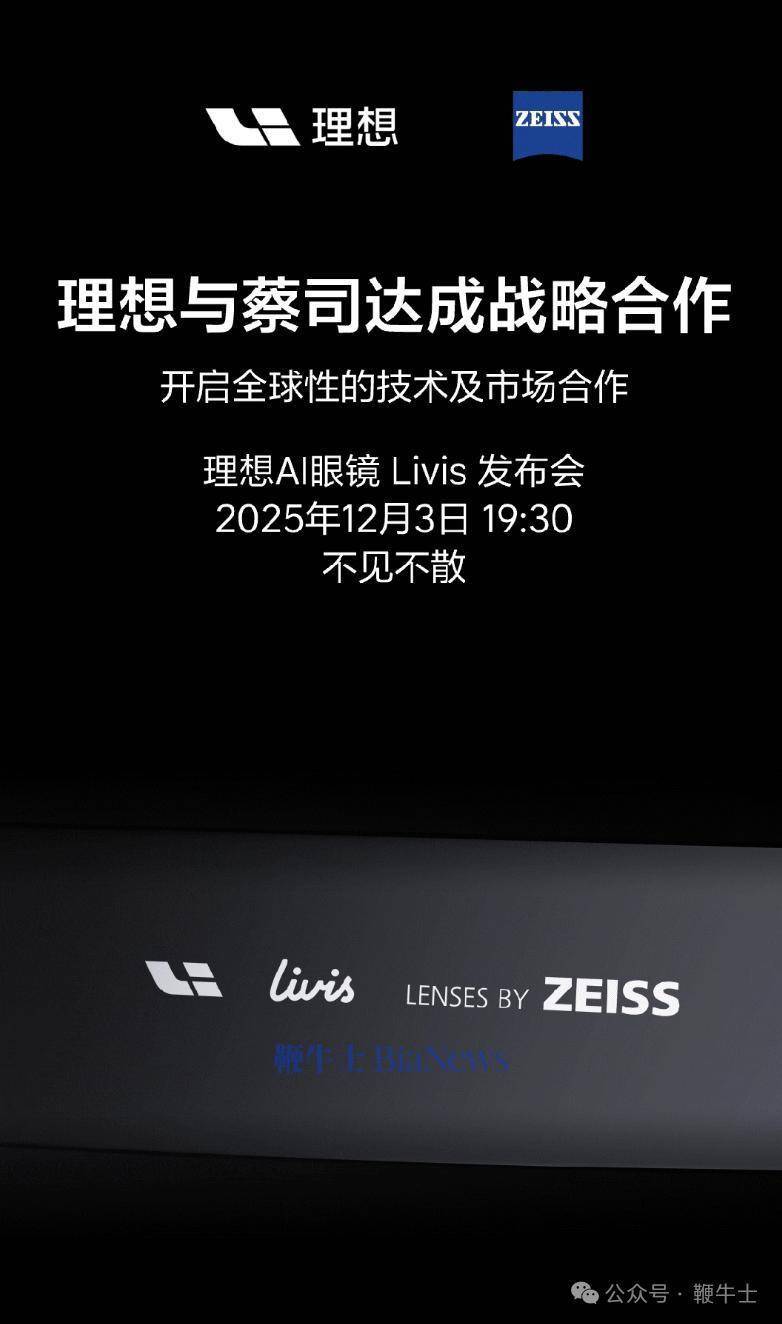 据悉,理想今日宣布,与蔡司达成战略合作,将于明晚19:30正式召开AI眼镜Livis发布会。