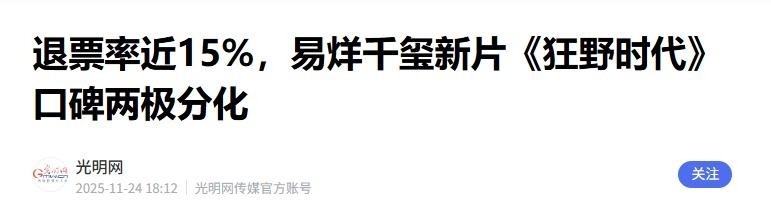 39. 光明网 2025.11.24 退票率近15%,易烊千玺新片《狂野时代》口碑两极分化